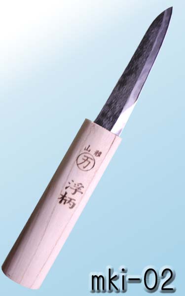 日本刀の伝統技術をそのまま生かし、一丁一丁手造り鍛造された最高級包丁。刃身には鋼材の最高峰、青紙鋼を使用。高い硬度を有し鋭利性、耐摩耗性に大変優れております。柄は軽い桐材で大きく出来ており、船上作業、海上作業において海中に落としても浮くように出来ている。